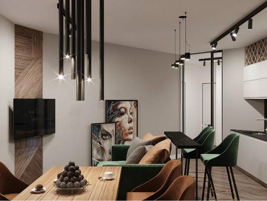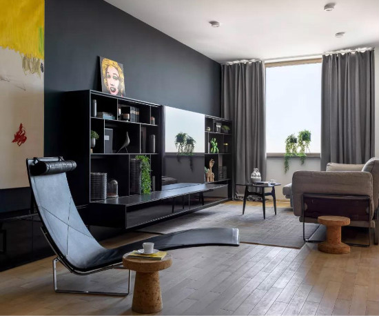 除了白色與淺灰,黑白灰作為經(jīng)典配色方案,把黑色或是深灰色作為墻面搭配的話,那么整體空間效果都會顯得格外的端莊有檔次了。
